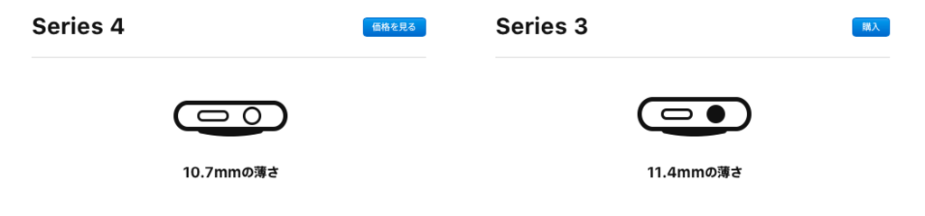 series 3は 11.4mmでしたが、series 4は10.7mmと0.7mmの薄型化になっております。0.7mmは結構薄くなったと感じれるくらいの違いです。今までのAppleWatchは若干厚いと思っていたのでこれは嬉しいところです。