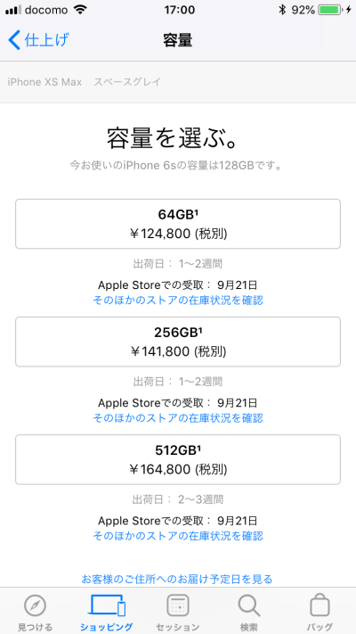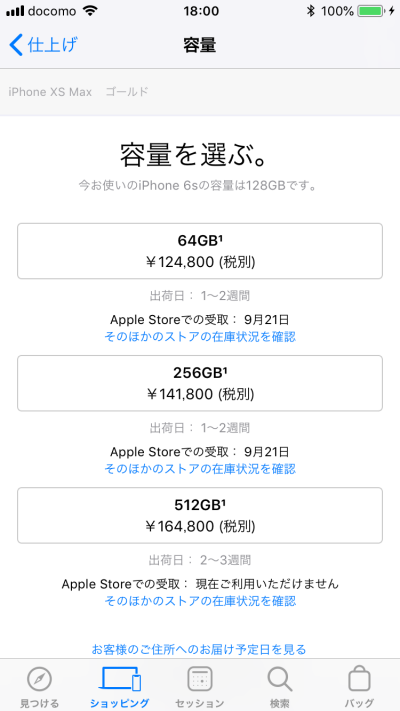 18時00分でXS MAX のApple Storeでの当日受け取りも終了
